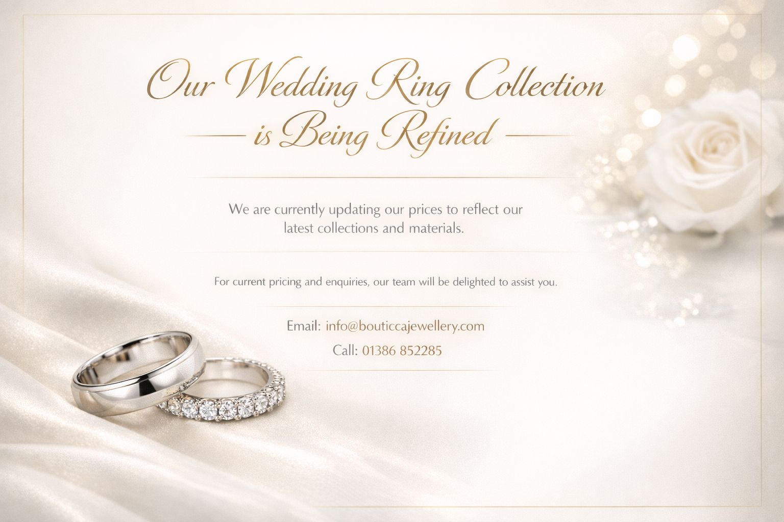 Discover an exquisite collection of wedding rings in Broadway, nestled in the heart of the Cotswolds. Perfectly crafted to celebrate your love, our timeless designs blend elegance and romance. Serving Gloucestershire, Worcestershire, and beyond, we offer a curated selection to make your special day unforgettable. All of our wedding rings are made within 30 miles of our Cotswolds store. Visit our Broadway boutique for a truly personal experience in a picturesque setting.